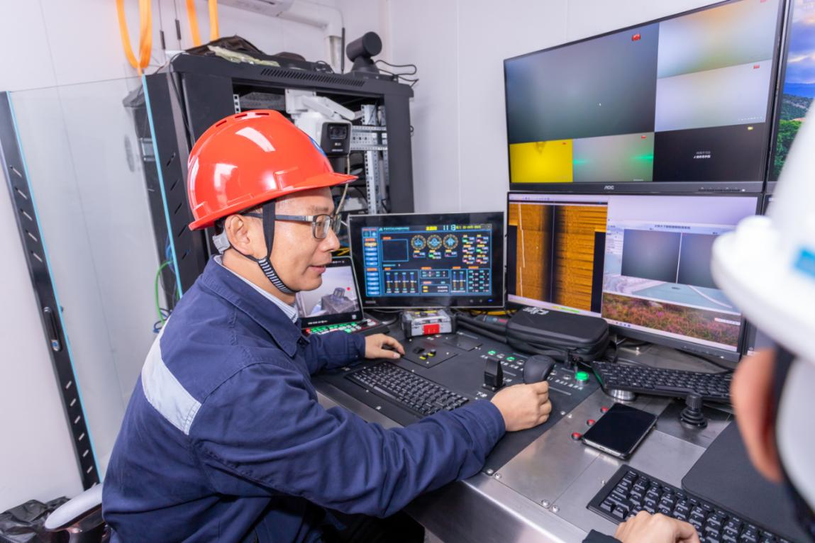 集裝箱里,三峽集團長江電力、科研院,中科院和河海大學等單位的技術人員守在電腦操作臺前,實時掌握現場作業情況。檢修現場,技術人員各自忙開,對機器人“小豬佩奇”開展入水前的最后檢查。