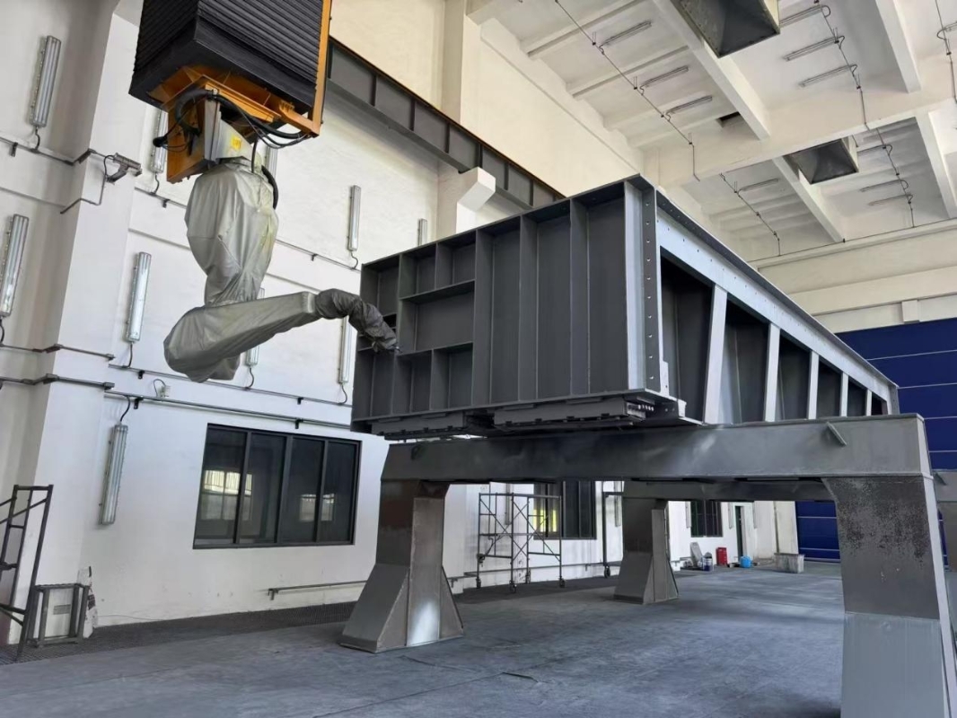 確定了方向,團隊先后赴多家船舶制造廠、金屬結構防腐廠開展實地調研,重點了解不同類型噴涂機器人的結構形式、運動方式、軌跡控制能力、噴槍適配性能以及在復雜鋼結構表面作業中的實際表現,對比分析了多種方案在作業范圍、靈活性、工藝成熟度和改造潛力等方面的差異。經過反復論證,項目團隊決定引入船舶通用噴涂機器人。